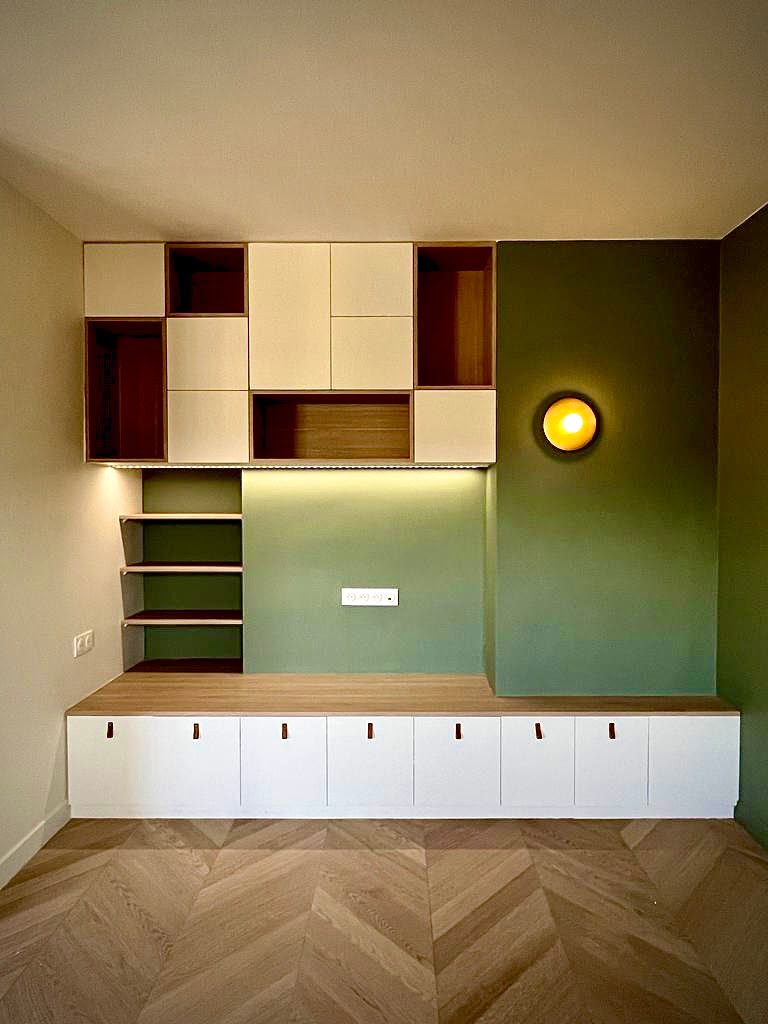 De la menuiserie sur mesure à la plomberie, de l’électricité à la pose du papier peint, notre équipe a métamorphosé cet appartement de 114m2 avec passion et expertise. Chaque détail a été soigneusement pensé, chaque idée a pris vie.
